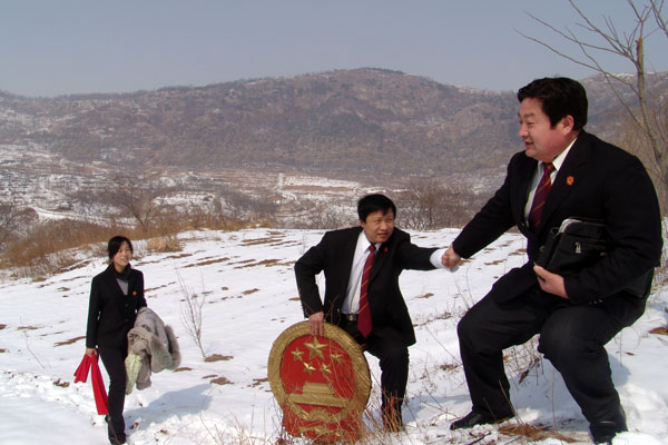 为把“以人为本、执政为民”落到实处,山东省莒南县法院扎实开展上门立案、下乡开庭等司法便民、利民活动,方便偏远山区、老弱病残的当事人诉讼维权,让百姓感受到司法温暖。3月1日,该院法官要前往涝坡镇高家柳沟村就地开庭审理一赡养纠纷案,可昨夜老天来了个大雪堵门,车辆无法通行,法官只好步行前往。图为法官采用“我推你一下,你拉我一把”的办法在崎岖溜滑的山路上前进。