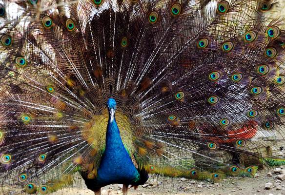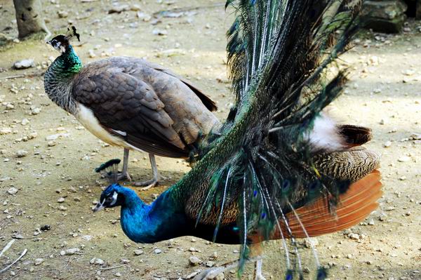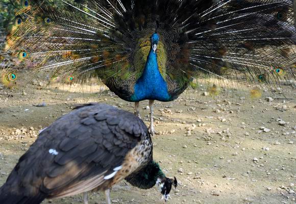 摄于三峡库区绿岛风情养殖园,供游客观赏的绿孔雀冬季开屏欢
