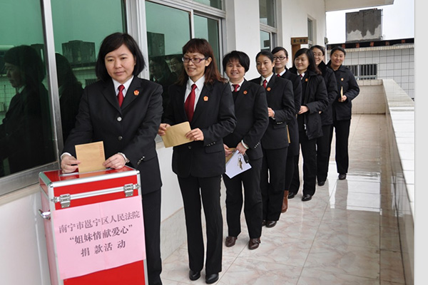 女法官在捐款 本网讯(冀婷婷) 3月7日上午,广西南宁市邕宁区法院开展以“姐妹情,献爱心”关爱困难女职工为主题的捐款活动。 在院党组的积极组织和带头作用下,该院女干警怀着满腔热情,纷纷献出自己的一份爱心,款项将用于援助特困女职工及资助考入大学的困难女职工子女。在捐款活动结束后,邕宁区法院干警代表到南宁市邕宁区糖业公司、八鲤水泥厂宿舍楼看望困难女职工,并送去油、米等慰问物品,表示对她们节日的关怀。邕宁区法院女法官用自己的热情与爱心,用这种特殊的方式——迎接“三八”妇女节的到来。 责任编辑: