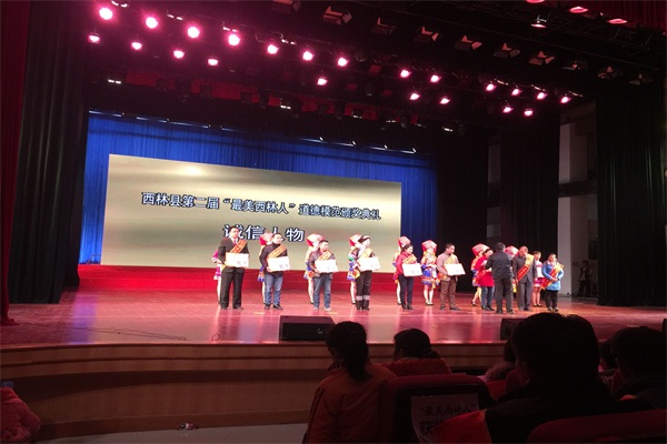图左一为潘冠霖。 本网讯(韦秋婷) 1月25日晚,第二届“最美西林人”暨2015年“千团万场”文艺汇演颁奖晚会在西林县句町文化艺术中心举行。广西西林县人民法院法官潘冠霖获“最美西林人之诚信人物”。 潘冠霖同志于2011年在通过公务员定向委培考录进入西林县人民法院工作。通过不断努力和学习,他从一名普通干警成长为刑事审判庭的一名法官,同时也是刑庭的负责人。他所提倡开展的“寓教于审、惩教结合”的教育型审判方式和人性化审判工作为挽救失足少年,预防他们重新犯罪取得了良好成效,受到了广泛赞誉。 责任编辑: