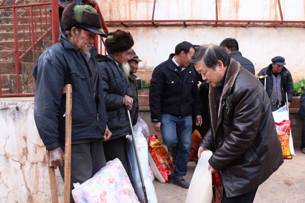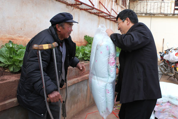 图为段玉波院长为村民送上棉被。 送大米。 本网讯(毕国琼) 1月27日,在新春佳节即将来临之际,江西省会泽县人民法院院长段玉波,副院长刘宏、张明翔分别带领3组干警,深入迤车镇梨园村、张家村、乐业镇双沟村,代表全院干警看望慰问“挂包帮”、“转走访”联系户,为他们送去温暖、带去新春的祝福。 每到一处,法院干警都与村民们亲切交谈,仔细询问生产、生活情况,提前预祝村民春节快乐、阖家幸福。村民们满怀真诚地表达自己的谢意,感谢法院的关怀,感谢干警们冒着严寒为他们送来温暖。 据悉,会泽法院在此次开展的春节送温暖活动中,走访慰问困难户50余户,送去大米1500斤、棉被30床。 责任编辑: