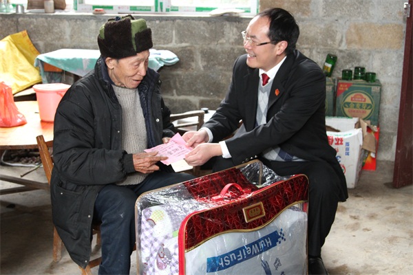 图为谢灵俊给困难党员送去棉被与慰问金。 本网讯(张淑媛) 1月29日下午,广西大化县人民法院党组书记、院长谢灵俊在北景镇党委书记韦海波的陪同下,先后到北景镇江栋村、六华村、汉达村开展春节慰问活动,将县委、县政府的关怀及时送到困难群众手中,确保困难群众、老党员、优抚对象过上一个温暖的春节。 谢灵俊一行来到江东村敬老院,看望慰问了住在敬老院的8位五保老人,认真听取了敬老院管理情况的介绍,仔细察看敬老院的饮食营养、卫生状况以及老人们的住宿情况。谢灵俊与老人们一一握手,送上了慰问金,向他们表示新春的祝福。谢灵俊说,党委、政府非常惦记敬老院里老人们,他代表县委、县政府给各位老人拜年,祝他们身体健康、春节愉快。 在老党员覃老汉家里,谢灵俊亲切地与老人交谈。看到老人身体硬朗、精神矍铄,谢灵俊很高兴,他感谢老人这么多年来为党的事业作出贡献,希望覃老保重身体,安享晚年。谢灵俊亲切的问候和暖心的话语,让85岁的老党员覃老激动不已,紧紧握着谢灵俊的手连声说:“谢谢,谢谢党的关心!” 随后,谢灵俊还看望慰问了六华村韦利先、汉达村百岁老人周尚林等5户困难群众。每到一户,谢灵俊都关切地询问他们的身体状况和衣食住行等情况,为他们送上慰问品和慰问金,并嘱咐随行干部一定要多关怀、多照顾这些困难群众的生活,确保他们过一个祥和的春节。 责任编辑: